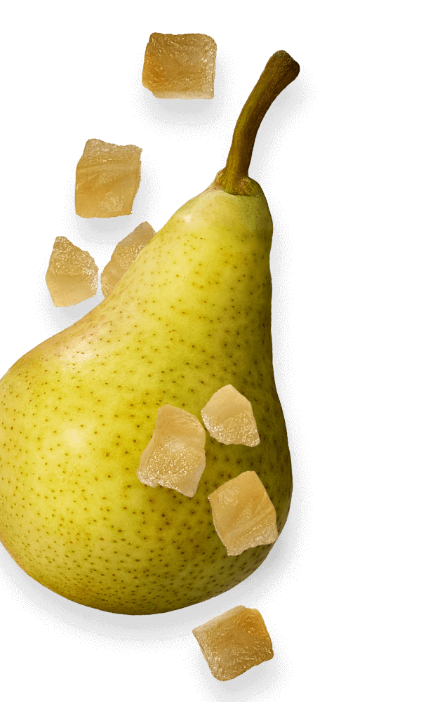 Succosi e naturalmente dolci, i canditi di pere portano una dolcezza morbida che bilancia le note sapide del formaggio.
